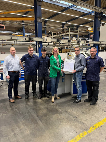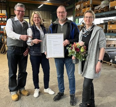 Markus Grube, kfm. Leiter SMF Spanlose Metall Formung GmbH & Co. KG / Theodor Ringkamp GmbH und Jörn Heidfeld, Leiter Qualitätsmanagement haben die Urkunde TOP-Ausbildungsbetrieb aus den Händen von Ann-Kristin Erdmann, Bereichsleiterin Innungen der…
