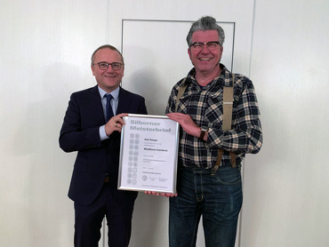 Markus Hatzfeld, Geschäftsführer der Firma MCH in Beelen, hat die Urkunde TOP-Ausbildungsbetrieb aus den Händen von Ann-Kristin Erdmann, Bereichsleiterin Innungen KH Steinfurt Warendorf, entgegen genommen.
